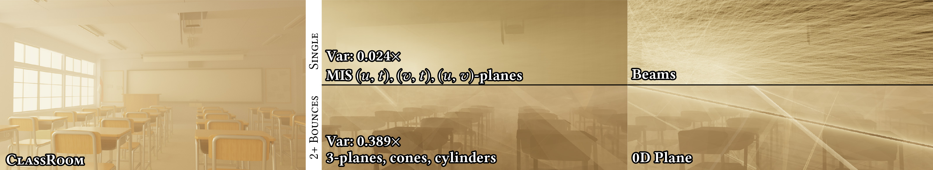 We compare the equal-time variance of different estimators in a scene containing participating media. We show the full light transport in the scene (left), single scattering (middle/right, top half) and multiple scattering volumetric transport (middle/right, bottom half). Our estimators (middle) provide significant variance reduction compared to prior density estimators (right) at equal render time.