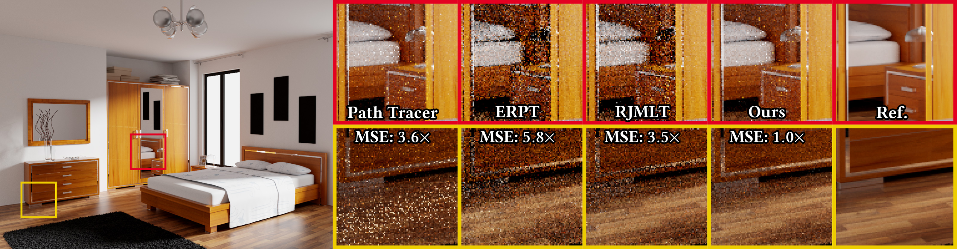 For this indoor scene lit by a sun/sky environment emitter, path tracing resolves most of the lighting well, but introduces high variance in the reflective caustic cast by the mirror. ERPT and RJMLT resolve the caustic better, but do not handle diffuse lighting well and introduce noise and temporal flickering. Our method uses MLT to only resolve the difficult paths using bidirectional path tracing, and handles everything else with path tracing, leading to significantly improved MSE (relative MSE shown in insets) and vastly reduced temporal flickering. Scene ©SlykDrako.